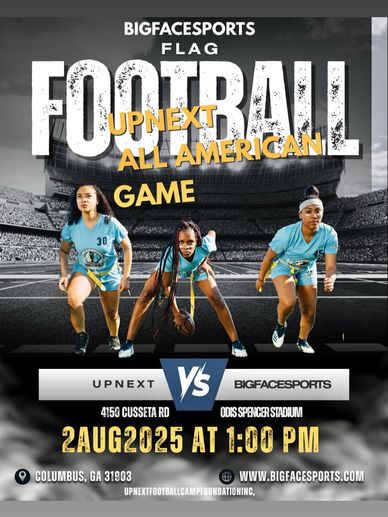 The BigFaceSports UPNEXT FLAG FOOTBALL ALL AMERICAN GAME is an upcoming flag football tournament scheduled for August 2, 2025, at Odis Spencer Stadium in Columbus, Georgia. This event will feature top female flag football players competing for the UPNEXT ALL AMERICAN TROPHY and a chance to secure a free athletic scholarship. College coaches will be present to scout for talent, making it an excellent opportunity for players to shine.